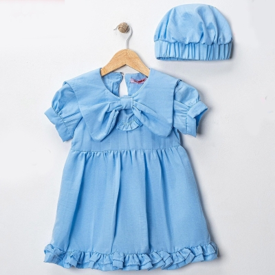 Kız Çocuk Mavi Müslin,Şapkalı Elbise